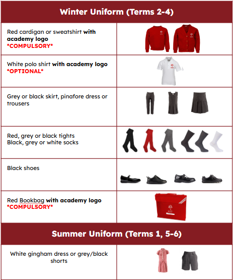 It is our policy that all children should wear academy uniform when attending school, or when participating  in an academy-organised event outside normal school hours. We provide a complete list of the items needed for academy uniform below.